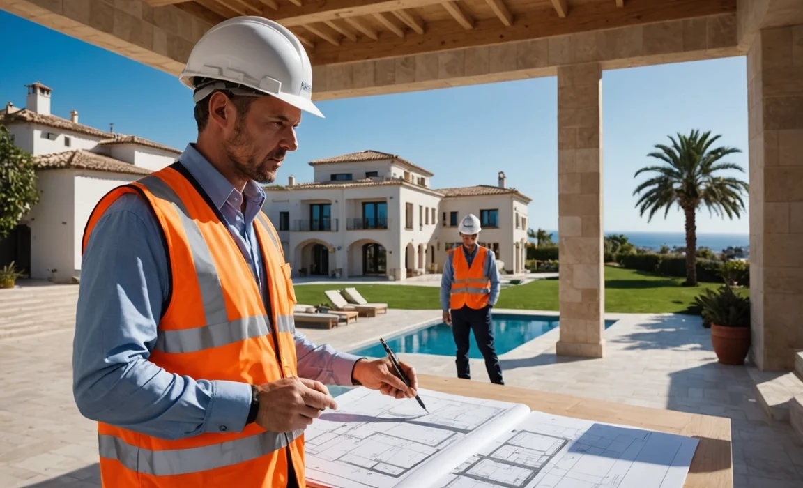 Project manager coordinating luxury villa construction, technical meetings, architectural plans review, professional construction management, Costa del Sol development, construction site coordination, high-end project management, Mediterranean architecture