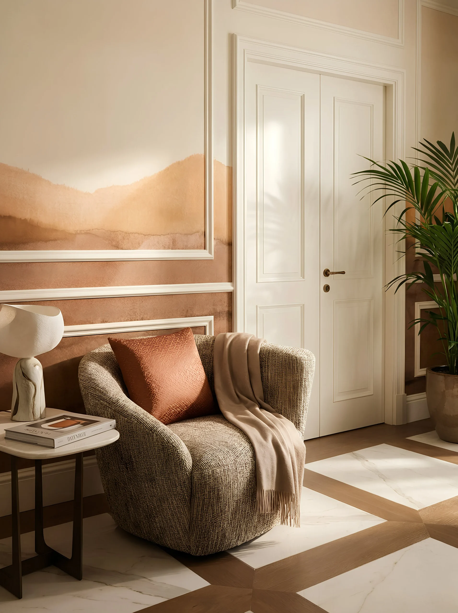 Installation of large-format Calacatta Prestigio and GRATO timber flooring in Hungarian Point pattern.